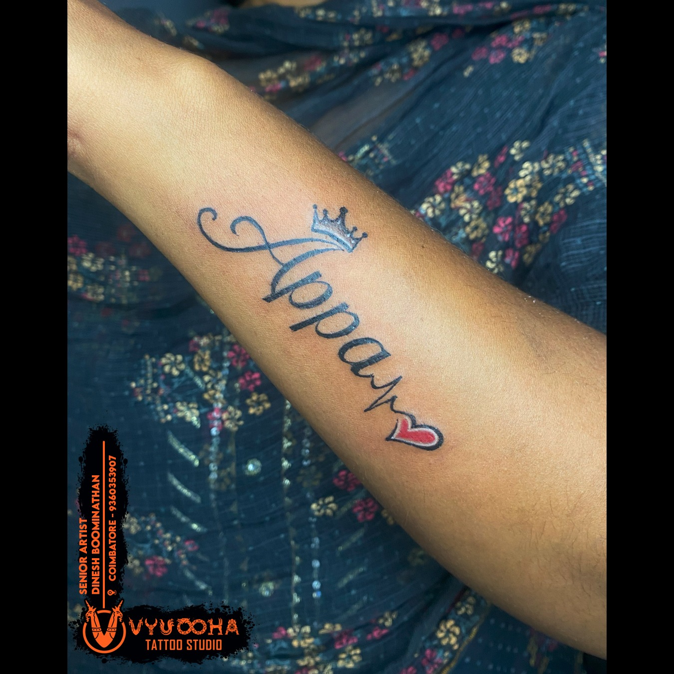 Appa Crown Heartbeat Tattoo Design – Father Love Tribute Tattoo sukrawarpet, Coimbatore This elegant “Appa” tattoo beautifully symbolizes unconditional love and respect for one’s father. The design features stylish calligraphy with a crown above “Appa, ” representing a father as a king, and a heartbeat ending in a red heart, expressing emotional connection and everlasting bond. Expertly inked by Senior Artist Dinesh Boominathan at Vyuooha Tattoo Studio, Coimbatore, this meaningful tattoo blends simplicity with deep emotion. Perfect for anyone wanting to honor their dad with a timeless design. Appa tattoo near by sukrawarpet, coimbatore, father love tattoo near me sukrawarpet, coimbatore, dad name tattoo sukrawarpet, coimbatore , heartbeat tattoo sukrawarpet, coimbatore, crown tattoo sukrawarpet, coimbatore, heart tattoo sukrawarpet, coimbatore, tribute tattoo for dad sukrawarpet, coimbatore, emotional tattoo design sukrawarpet, coimbatore, name tattoo sukrawarpet, coimbatore, Vyuooha Tattoo Studio sukrawarpet, coimbatore, Dinesh Boominathan tattoo artist sukrawarpet, coimbatore, meaningful tattoo sukrawarpet, coimbatore, minimalist name tattoo sukrawarpet, coimbatore, parent love tattoo sukrawarpet, coimbatore