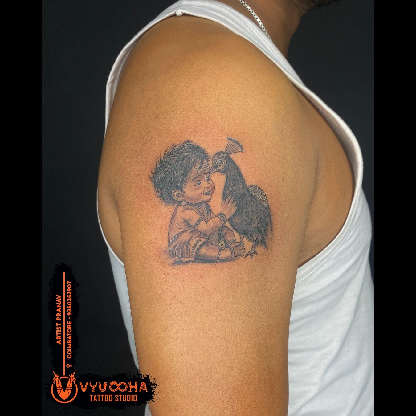 Baby Krishna with Peacock Tattoo on Shoulder – Vyuooh Tattoo Studio at selvapuram, Coimbatore This ...
