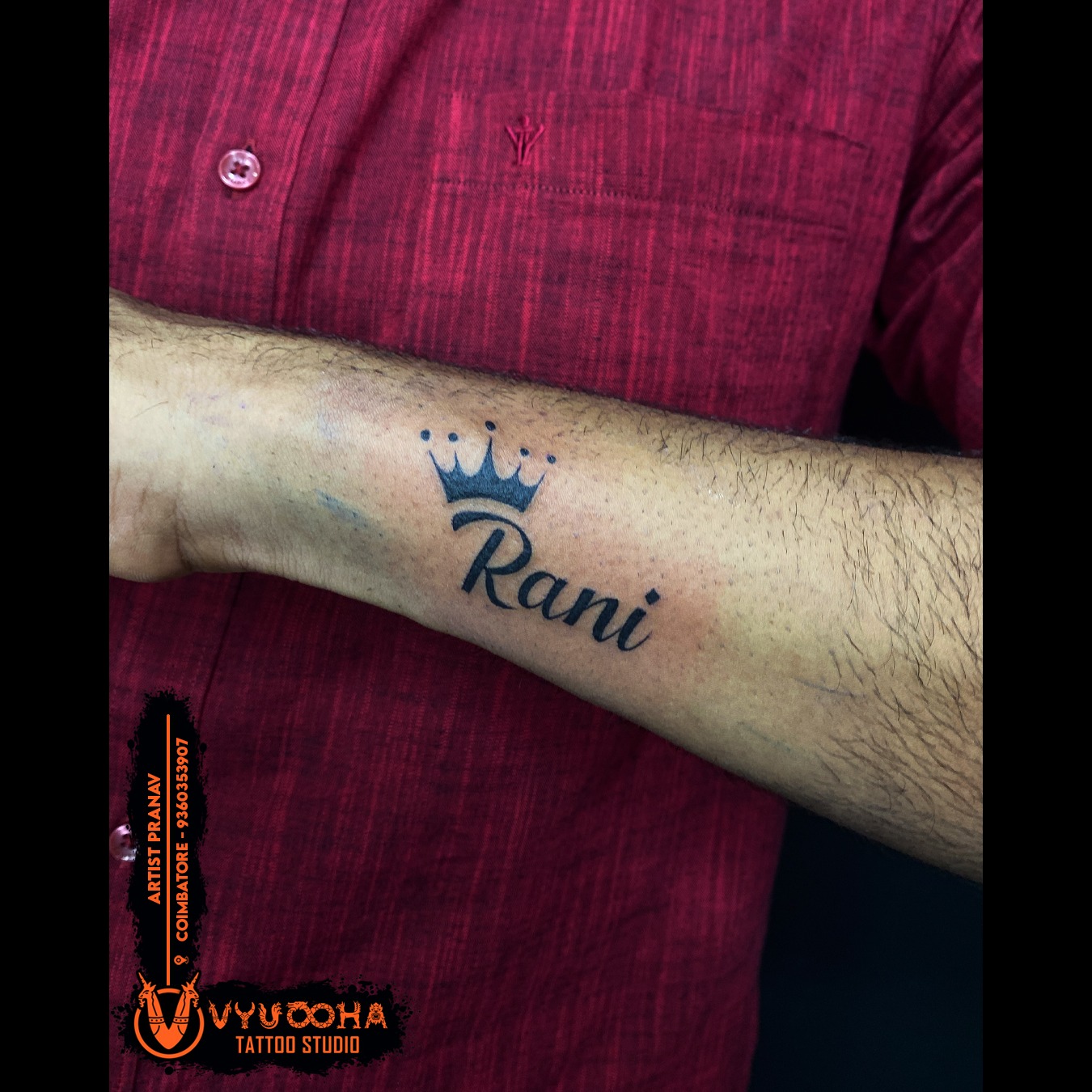 Crown Name Tattoo Design – Stylish 'Rani' Tattoo on Hand In Kovilpalayam, Coimbatore A beautiful custom name tattoo featuring the word 'Rani' in elegant cursive script, highlighted with a royal crown design above it. This tattoo symbolizes love, respect, and royalty, making it a perfect choice for dedicating to someone special. Inked at Vyuooha Tattoo Studio, Coimbatore by artist Pranav, this design blends simplicity with elegance for a timeless look. Other Name Crown name tattoo Near Me Kovilpalayam, Coimbatore Rani tattoo design Near By Kovilpalayam, Coimbatore Stylish hand tattoo Kovilpalayam, Coimbatore Name tattoo with crown Kovilpalayam, Coimbatore Custom lettering tattoo Kovilpalayam, Coimbatore Minimalist name tattoo Kovilpalayam, Coimbatore Elegant tattoo design Kovilpalayam, Coimbatore Vyuooha Tattoo Studio works Kovilpalayam, Coimbatore Tattoo artist Pranav Kovilpalayam, Coimbatore Best tattoo studio in Kovilpalayam, Coimbatore