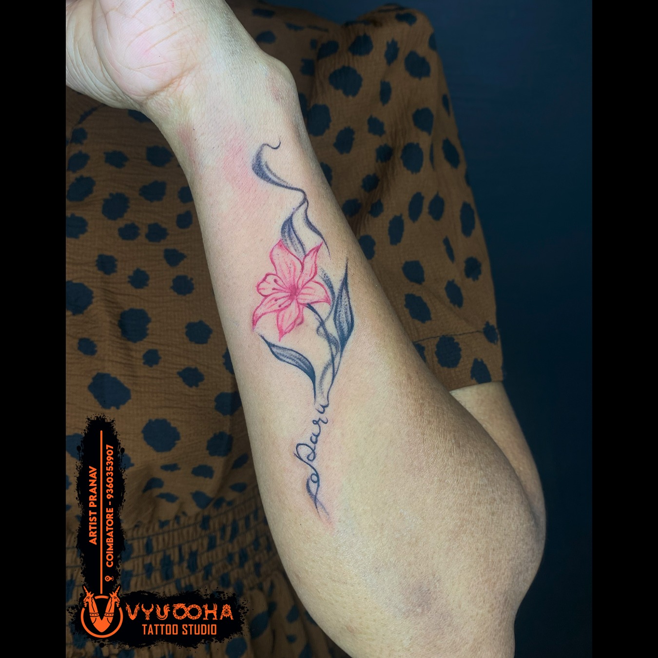 Elegant Flower with Name Script Tattoo on Forearm | Vyuooha Tattoo Studio in Vilankurichi Road, coimbatore Get this elegant flower with name script tattoo beautifully inked on the forearm by Artist Pranav at Vyuooha Tattoo Studio, Vilankurichi Road, coimbatore. A soft pink floral design blended with smooth black shading and customized lettering makes this tattoo perfect for women looking for a meaningful and stylish design. We maintain 100% hygiene, premium ink quality, and professional detailing for every tattoo. Flower with name tattoo near by Vilankurichi Road coimbatore, Forearm flower tattoo near me Vilankurichi Road coimbatore, Name script tattoo design Vilankurichi Road coimbatore, Elegant floral tattoo for women Vilankurichi Road coimbatore, Pink flower tattoo Vilankurichi Road coimbatore, Female forearm tattoo Vilankurichi Road coimbatore, Minimal flower tattoo Vilankurichi Road coimbatore, Vyuooha Tattoo Studio Coimbatore, Artist Pranav tattoo works Vilankurichi Road coimbatore, Stylish name tattoo Vilankurichi Road coimbatore, Custom script tattoo Vilankurichi Road coimbatore, Floral linework tattoo Vilankurichi Road coimbatore, Best tattoo studio Vilankurichi Road coimbatore, Tattoo artist in Vilankurichi Road coimbatore.