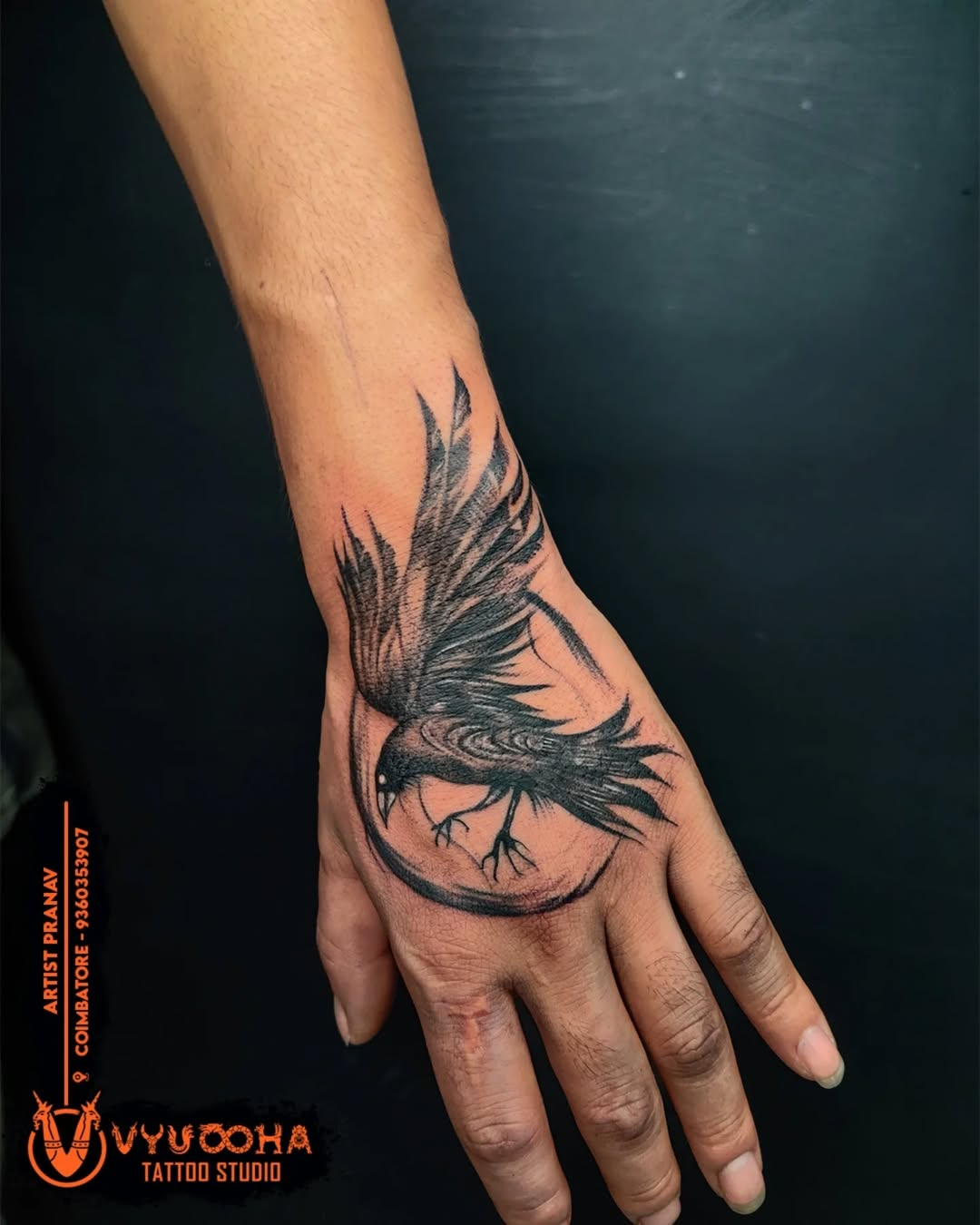 Embrace the darkness, rise with wisdom." 🖤 This stunning blackwork raven tattoo symbolizes mystery, transformation, and intelligence. A creature of the shadows, the raven reminds us that even in darkness, there is power. ⚫✨ Book Your Appointment . 9360353907 #vyuoohatattoostudio #bestartist #RavenTattoo #CrowTattoo #BlackworkTattoo #DarkAesthetic #MysticInk #TattooArt #InkAddict #TattooLover #DarkSoul #TattooDesign #HandTattoo #TattooStudio #TattooLife #GothicTattoo #EdgyInk #TattooInspiration #SymbolicTattoo