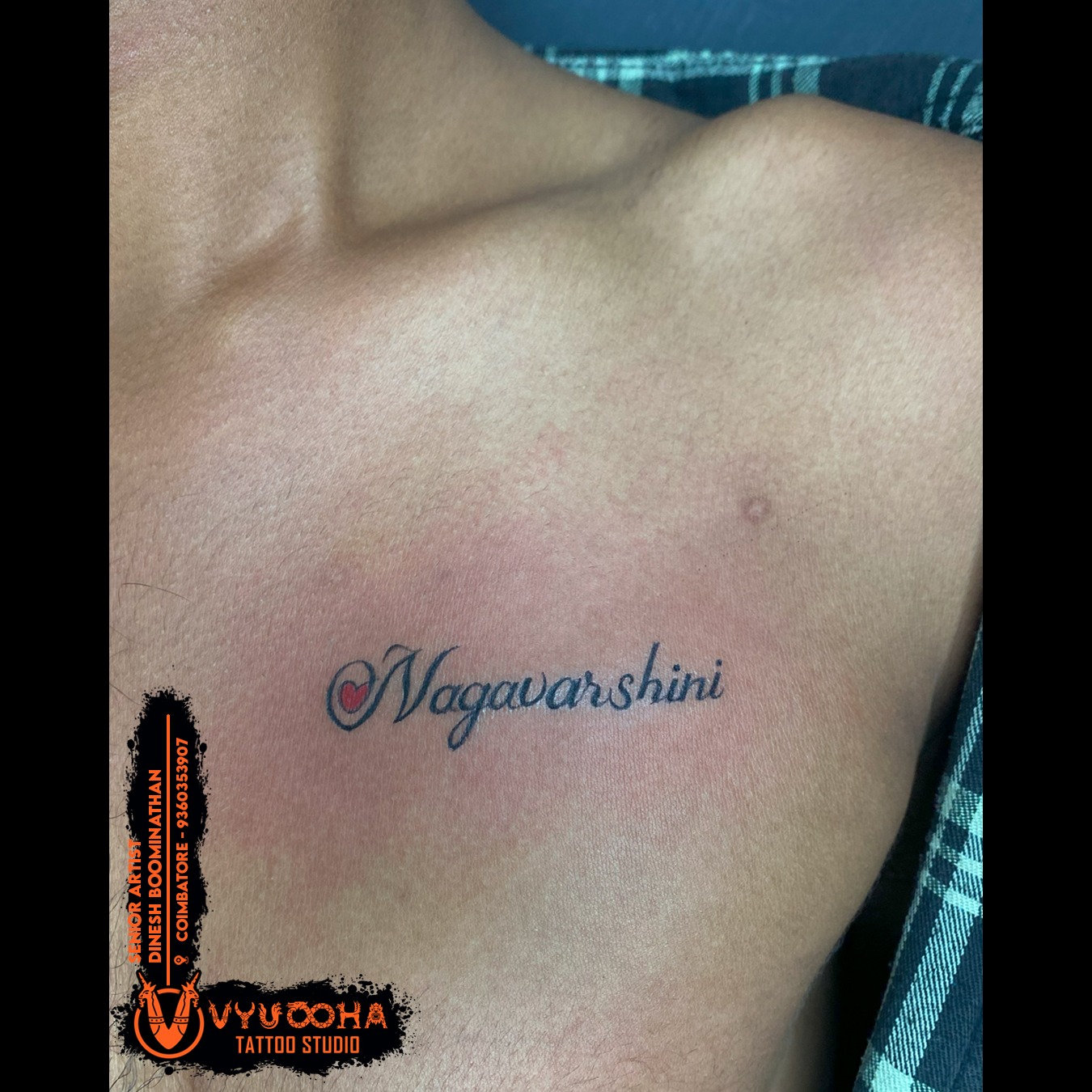 Name Tattoo on Chest – Elegant Script with Heart Design in Kuniyamuthur, Coimbatore This chest tattoo features the name “Nagavarshini” in a stylish cursive font, enhanced with a small red heart for a touch of love and personalization. Placed near the collarbone, this name tattoo represents deep affection, remembrance, and a special bond with a loved one. At Vyuoohatattoostudio Coimbatore, we specialize in creating customized name tattoos with unique fonts and minimalistic designs that carry strong emotional meaning. Name tattoo near by kuniyamuthur, Coimbatore, chest tattoo near me kuniyamuthur, coimbatore, collarbone tattoo kuniyamuthur, Coimbatore, script tattoo kuniyamuthur, Coimbatore, love tattoo, heart tattoo designkuniyamuthur, Coimbatore, personalized tattoo kuniyamuthur, Coimbatore, meaningful tattoo kuniyamuthur, Coimbatore, custom name tattoo kuniyamuthur, Coimbatore, Nagavarshini tattoo kuniyamuthur, Coimbatore, Vyuoohatattoostudio kuniyamuthur, Coimbatore, elegant font tattoo kuniyamuthur, Coimbatore, minimal tattoo design kuniyamuthur, Coimbatore, lettering tattoo kuniyamuthur, Coimbatore