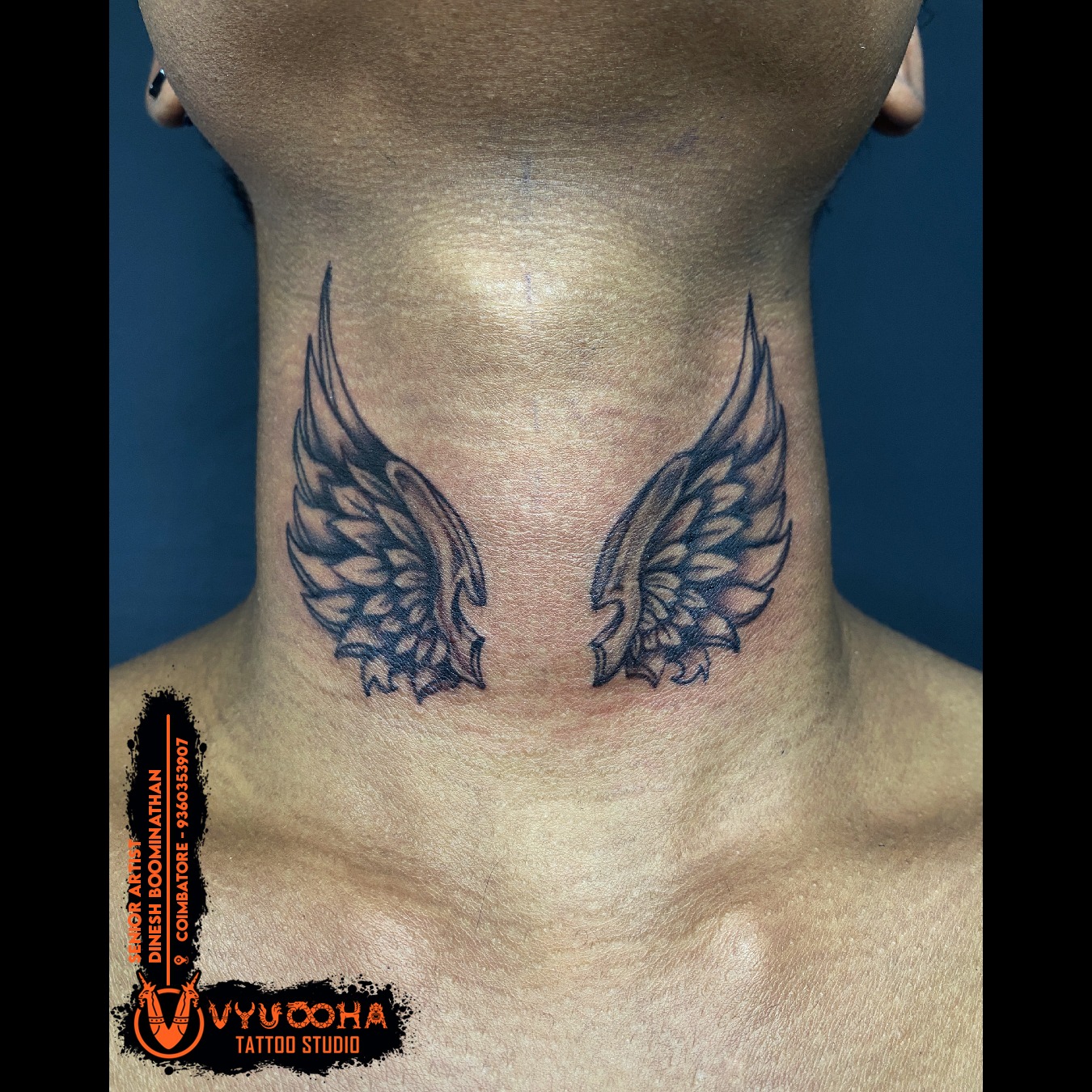 Neck Tattoo with Angel Wings – Stylish Wing Tattoo Design In Kovilpalayam A bold and artistic angel wings tattoo on the neck, symbolizing freedom, strength, and spirituality. This symmetrical wing design adds a powerful and stylish look, perfect for those who want a meaningful tattoo representing protection, growth, and independence. Created at Vyuooha Tattoo Studio, Coimbatore by Senior Artist Dinesh Boominathan, this tattoo showcases fine detailing and precision for a striking body art piece. Other Name Angel wings neck tattoo Near By Kovilpalayam, Coimbatore Stylish wing tattoo design Near Me Kovilpalayam, Coimbatore Neck tattoo ideas for men Kovilpalayam, Coimbatore Meaningful angel wings tattoo Kovilpalayam, Coimbatore Spiritual tattoo design Kovilpalayam, Coimbatore Freedom and strength tattoo Kovilpalayam, Coimbatore Custom neck tattoo artwork Kovilpalayam, Coimbatore Vyuooha Tattoo Studio Kovilpalayam, Coimbatore Tattoo artist Dinesh Boominathan Kovilpalayam, Coimbatore Best tattoo studio in Kovilpalayam, Coimbatore