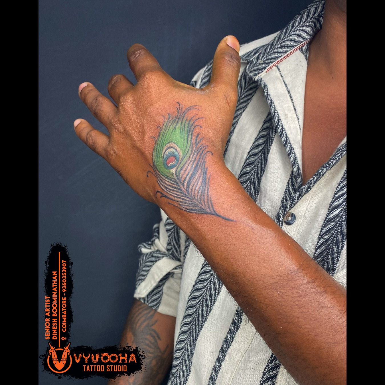 Peacock Feather Tattoo on Hand – Elegant Krishna Symbol Design | Vyuoohatattoostudio in Sukrawarpett... Peacock Feather Tattoo on Hand – Elegant Krishna Symbol Design | Vyuoohatattoostudio in Sukrawarpettai. Coimbatore This beautiful Peacock Feather Tattoo on the hand symbolizes grace, purity, and divine connection with Lord Krishna. Perfectly detailed with green and blue hues, this elegant design reflects peace, spirituality, and style. Crafted by Senior Artist Dinesh Boominathan at Vyuoohatattoostudio, Coimbatore, this tattoo adds a touch of tradition and modern artistry to your look. Peacock Feather Tattoo Near By Sukrawarpettai, Coimbatore, Peacock Feather Tattoo On Hand Near Me Sukrawarpettai, Coimbatore, Krishna Symbol Tattoo Sukrawarpettai, Coimbatore Spiritual Tattoo Design Sukrawarpettai, Coimbatore Elegant Feather Tattoo Sukrawarpettai, Coimbatore Vyuoohatattoostudio Sukrawarpettai, Coimbatore Dinesh Boominathan Tattoo Artist Sukrawarpettai, Coimbatore Divine Tattoo For Men Sukrawarpettai, Coimbatore Peacock Feather Tattoo Meaning Sukrawarpettai, Coimbatore Color Tattoo Designs Sukrawarpettai, Coimbatore Traditional Indian Tattoo Sukrawarpettai, Coimbatore